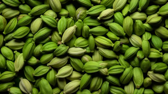 • Green Cardamom: Small, triangular, pale green pods (8–12 mm long) containing 15–20 tiny, sticky black seeds. The pods are thin and papery.